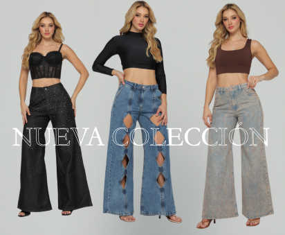 Ref: 92621-1 Jean wide leg, tono medio, rígido, un botón, con desgaste, cortes y cut out aberturas en rombos delanteros. La modelo mide 1.75 y usa talla 10. ...