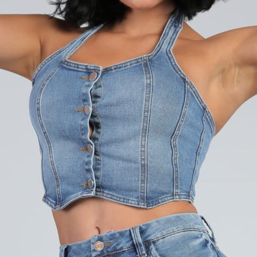 Ref: 84547-2 Chaleco corto, tono medio, stretch, con botones y espalda descubierta.
