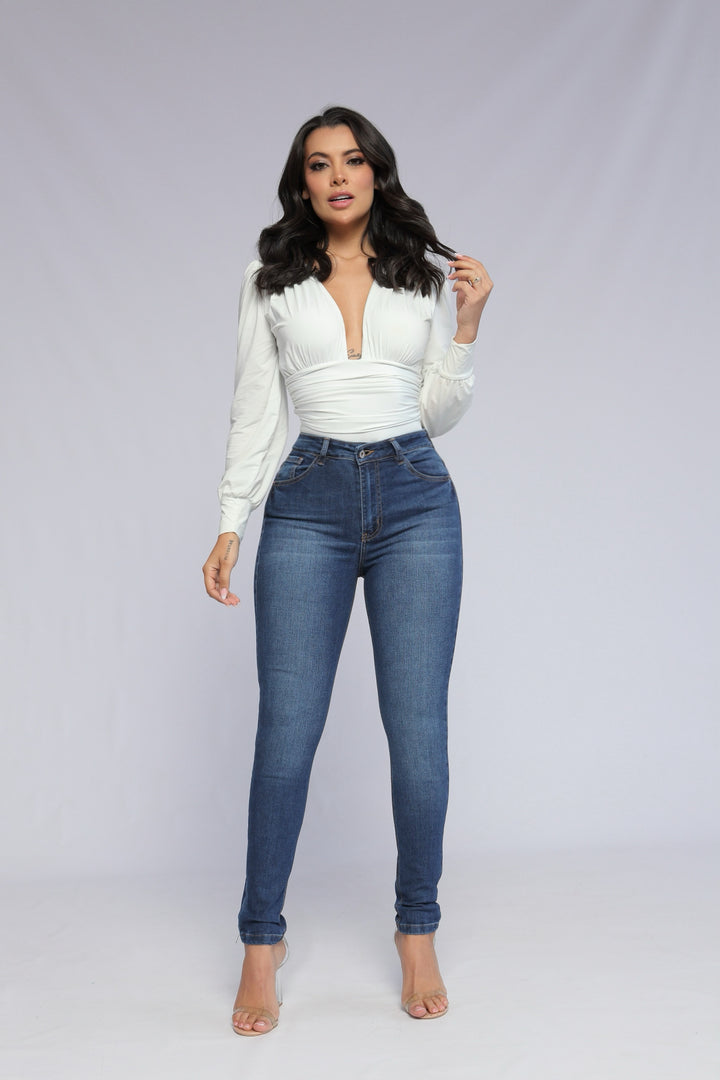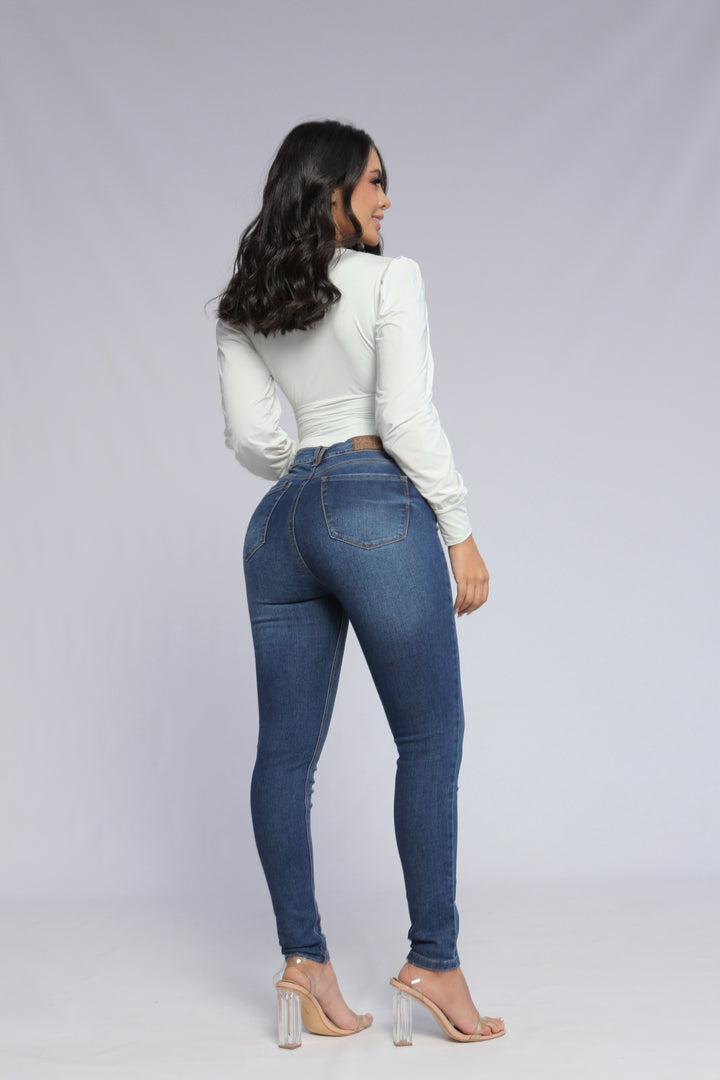 Ref: 15516-1 Jean skinny, tono oscuro, semi stetch, tiro alto, un botón, básico, con desgaste.