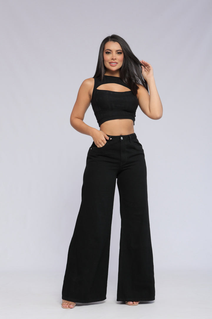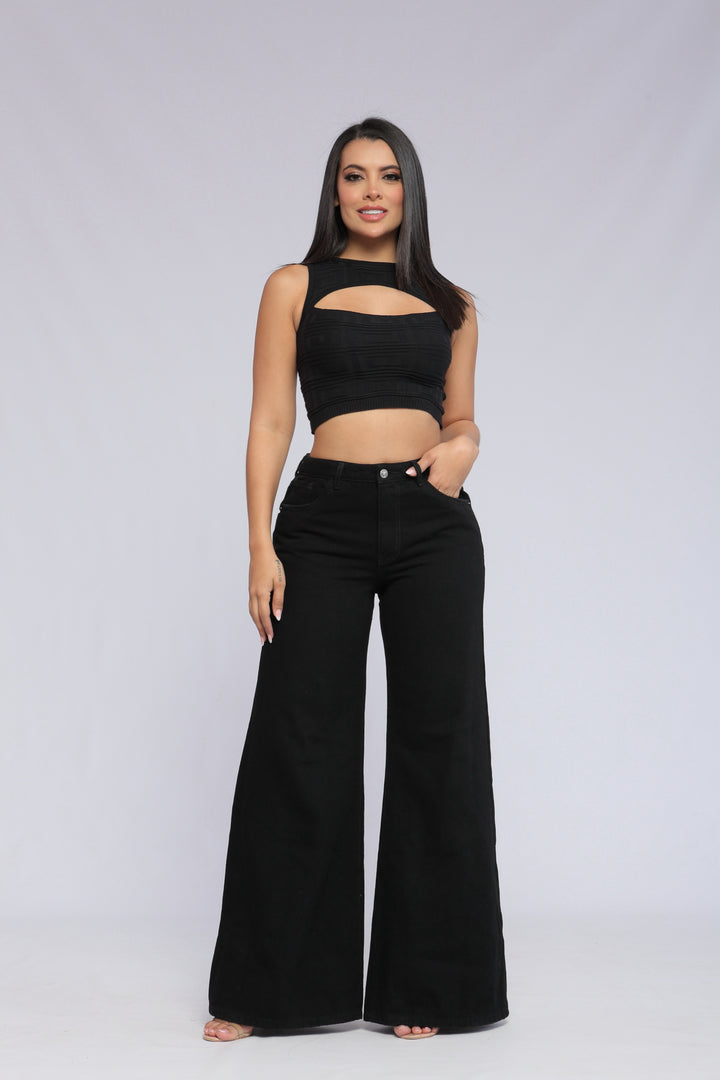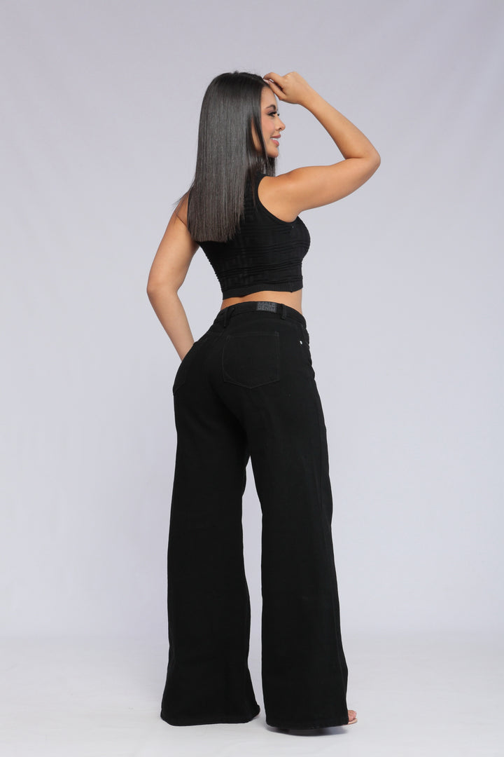Ref: 95534-5 Jean wide leg negro, rígido, un botón, tiro alto, básico.