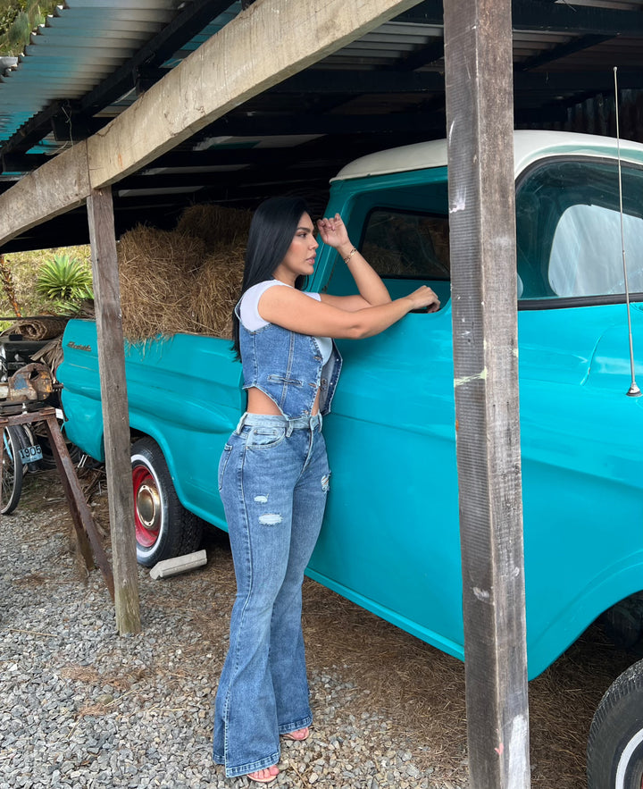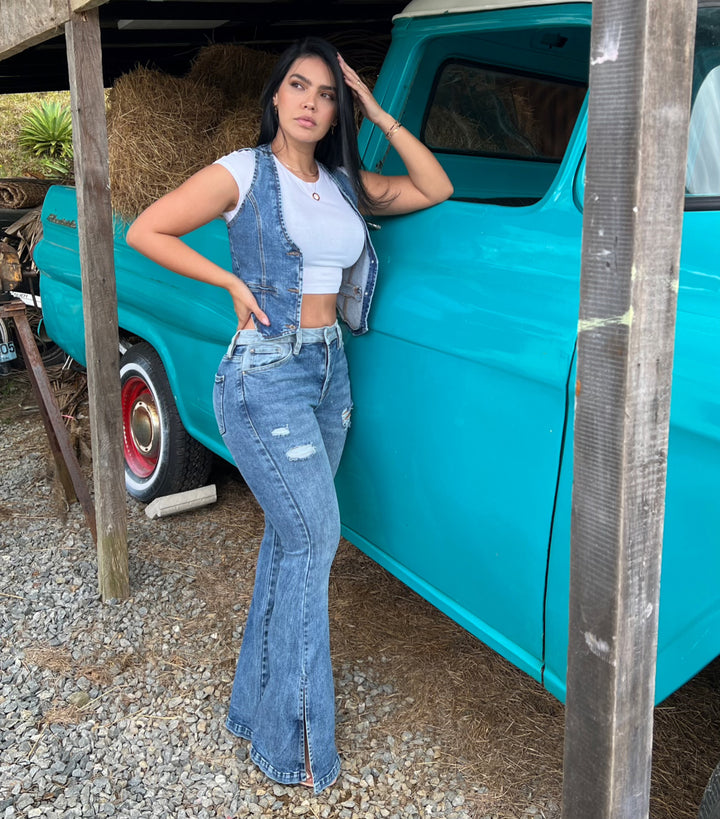 Ref: 212129 Jean bota campana, talle alto, tela strech, tono medio, pretina clara.