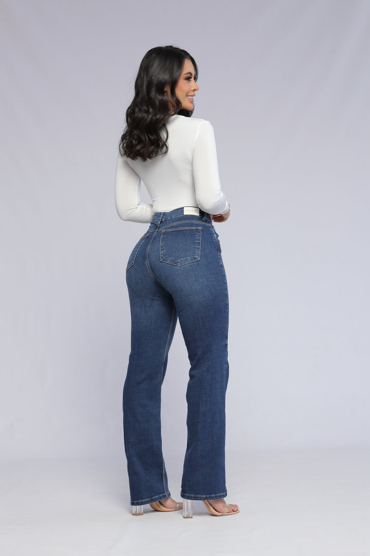 Ref: 35502-1 Jean bota recta, tono oscuro, stretch, tiro alto, un botón, básico.