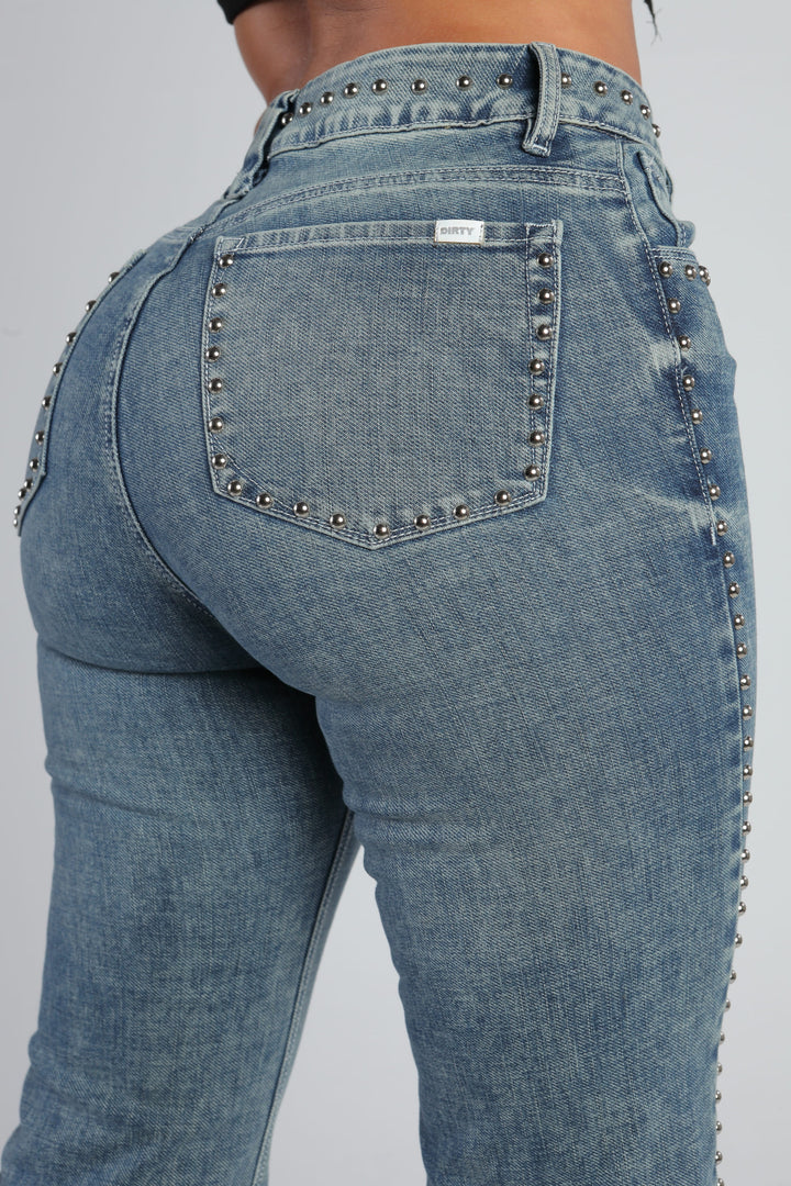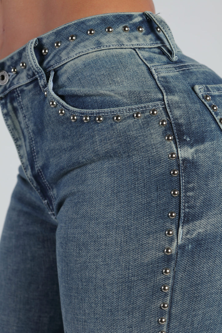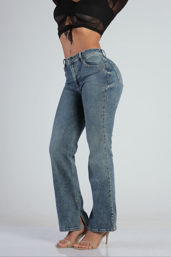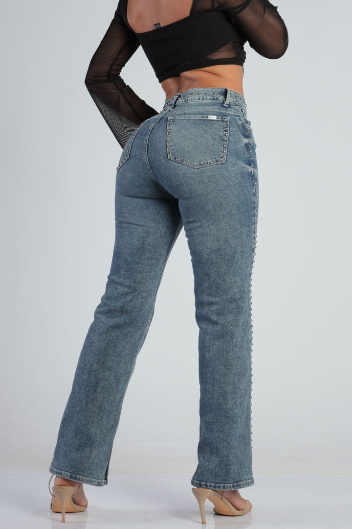 Ref: 34516-1 Jean bota recta, stretch, tono medio, un botón, con desgaste, con abertura en bota, taches en laterales, pretina y bolsillos delanteros.