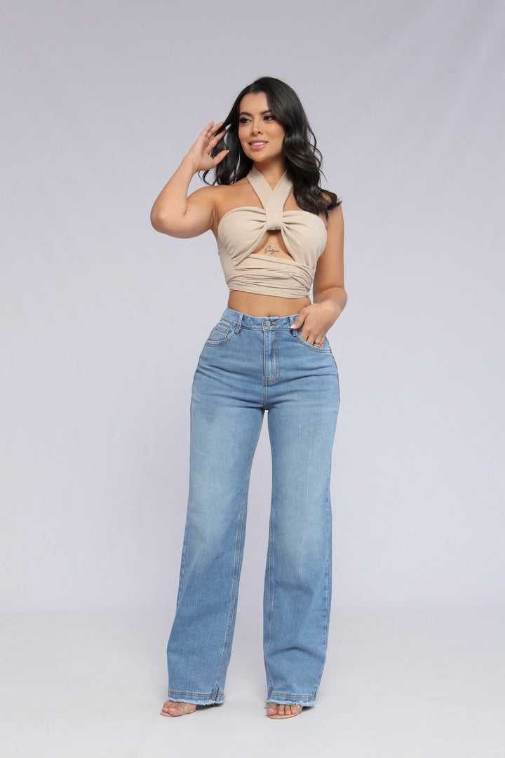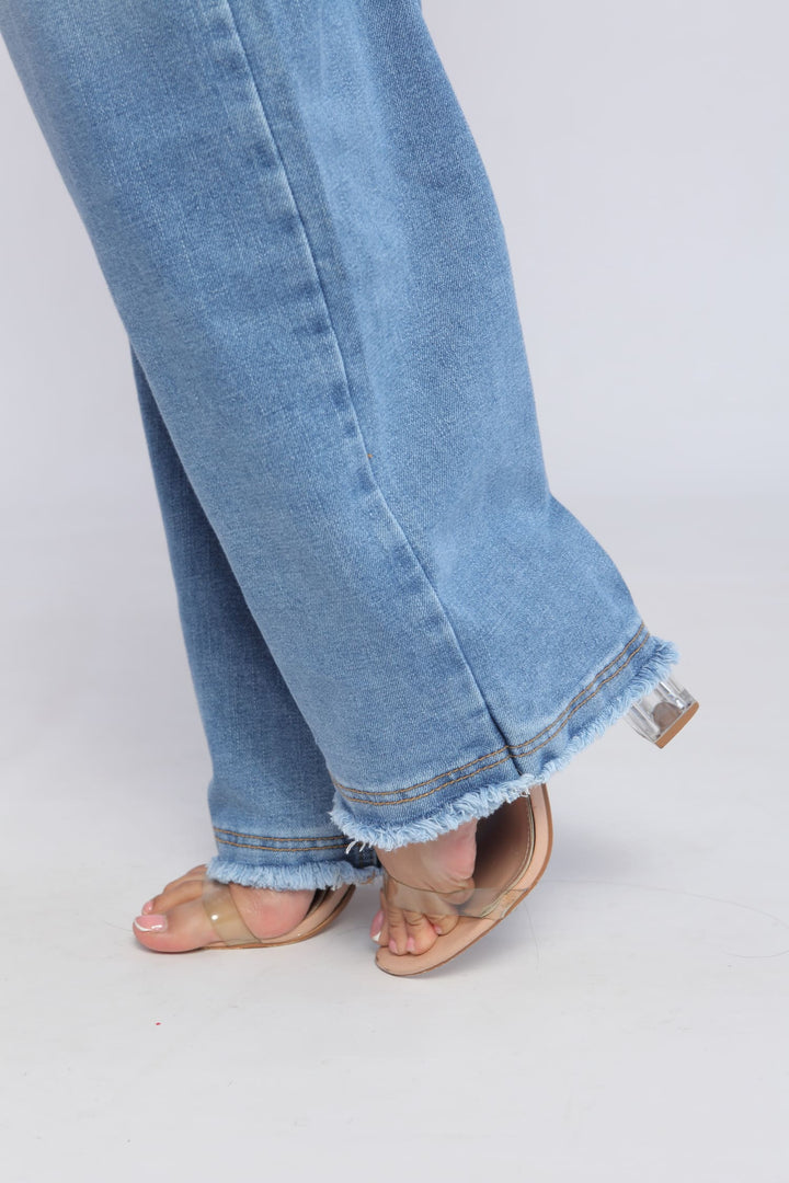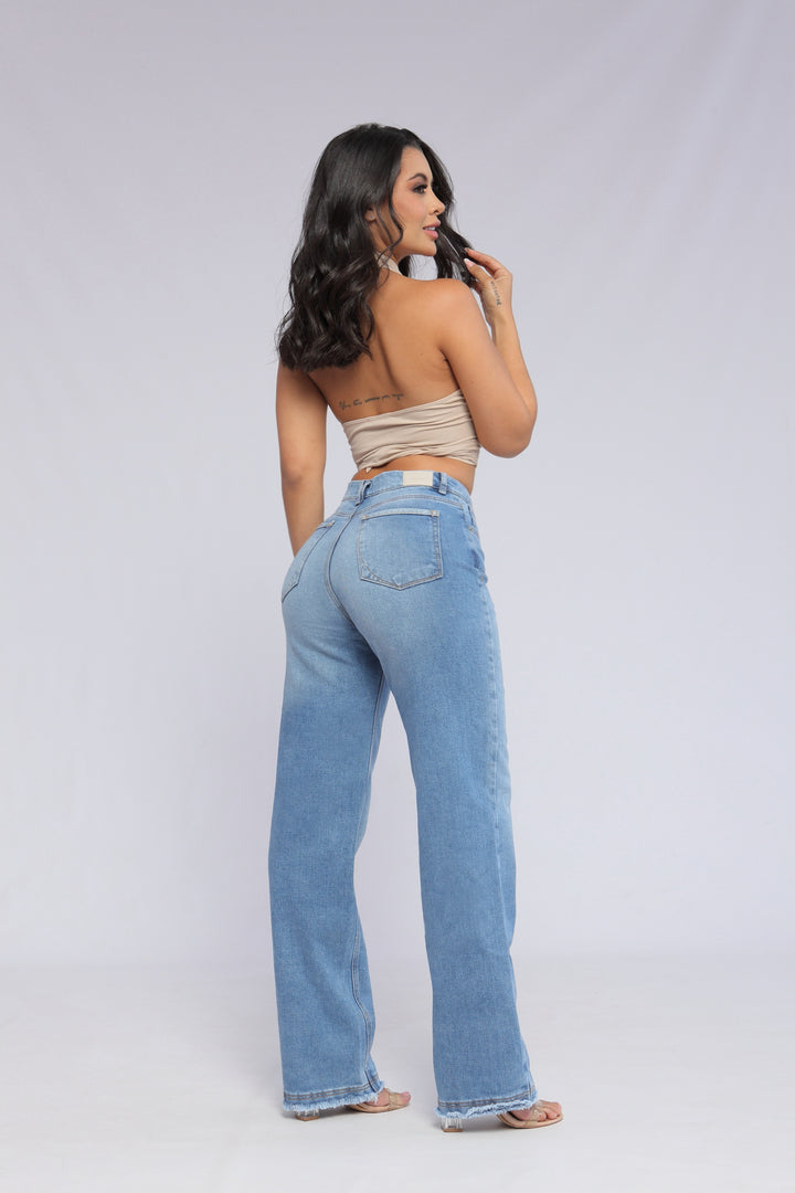 Ref: 35515-1 Jean bota recta, tono medio, semi stretch, tiro alto, un botón, con desgaste y bota desflecada.