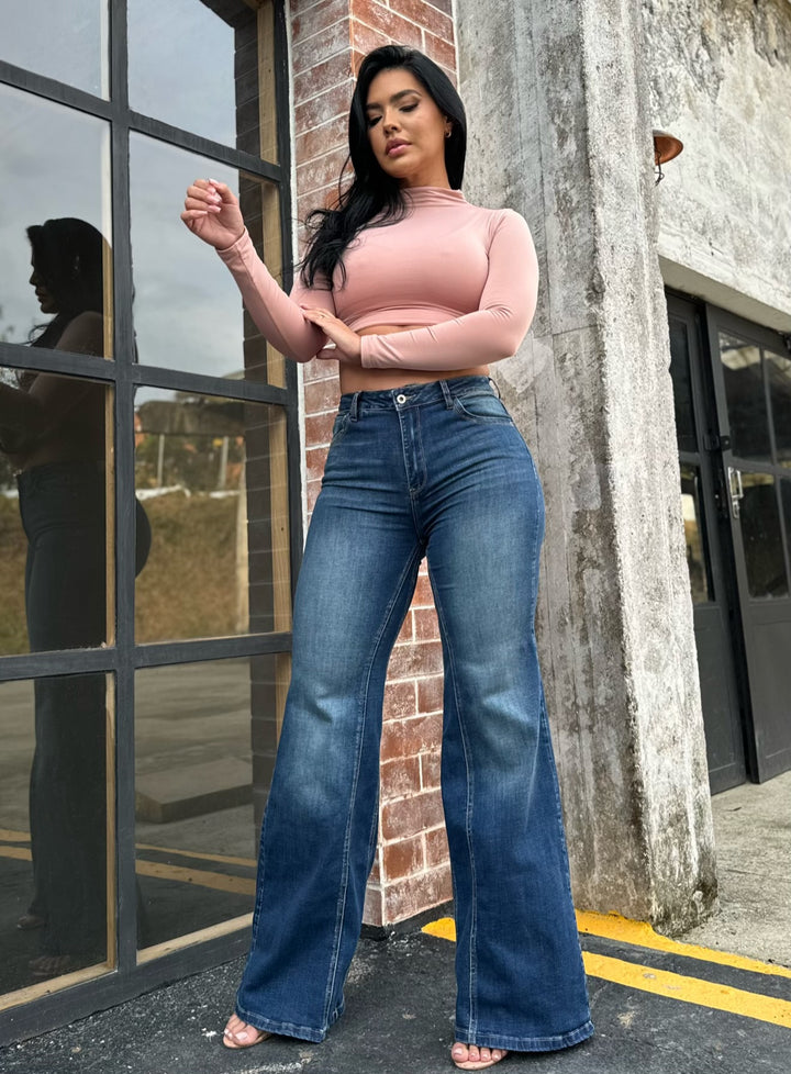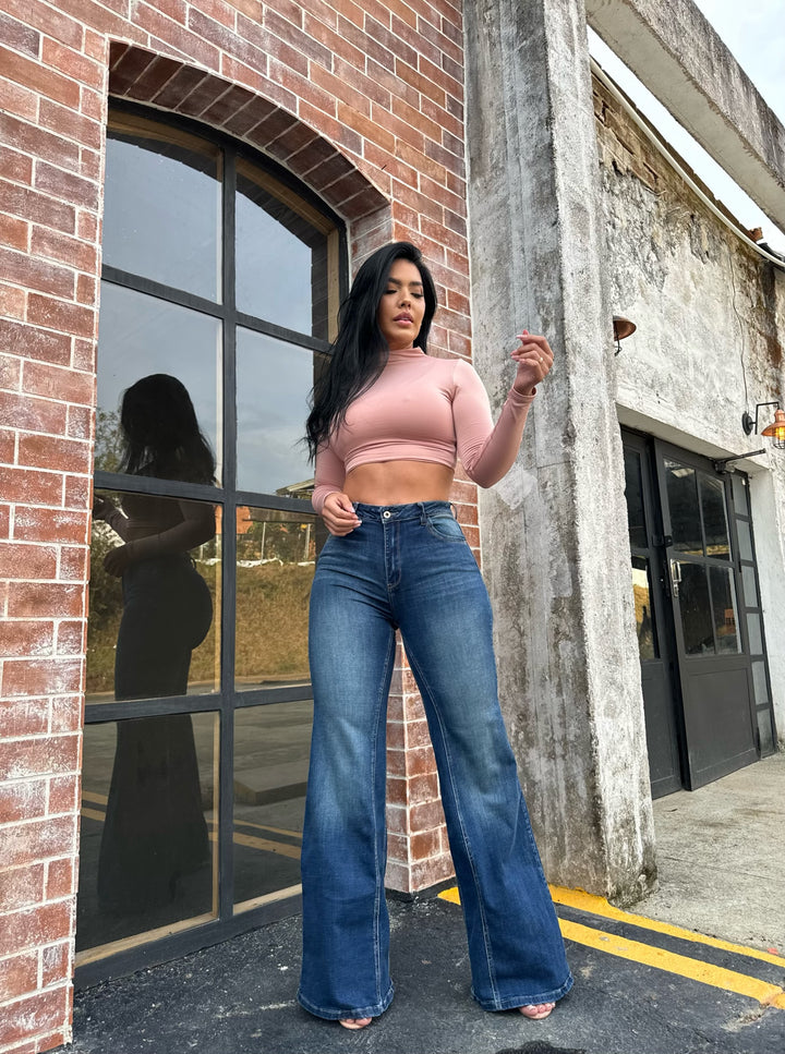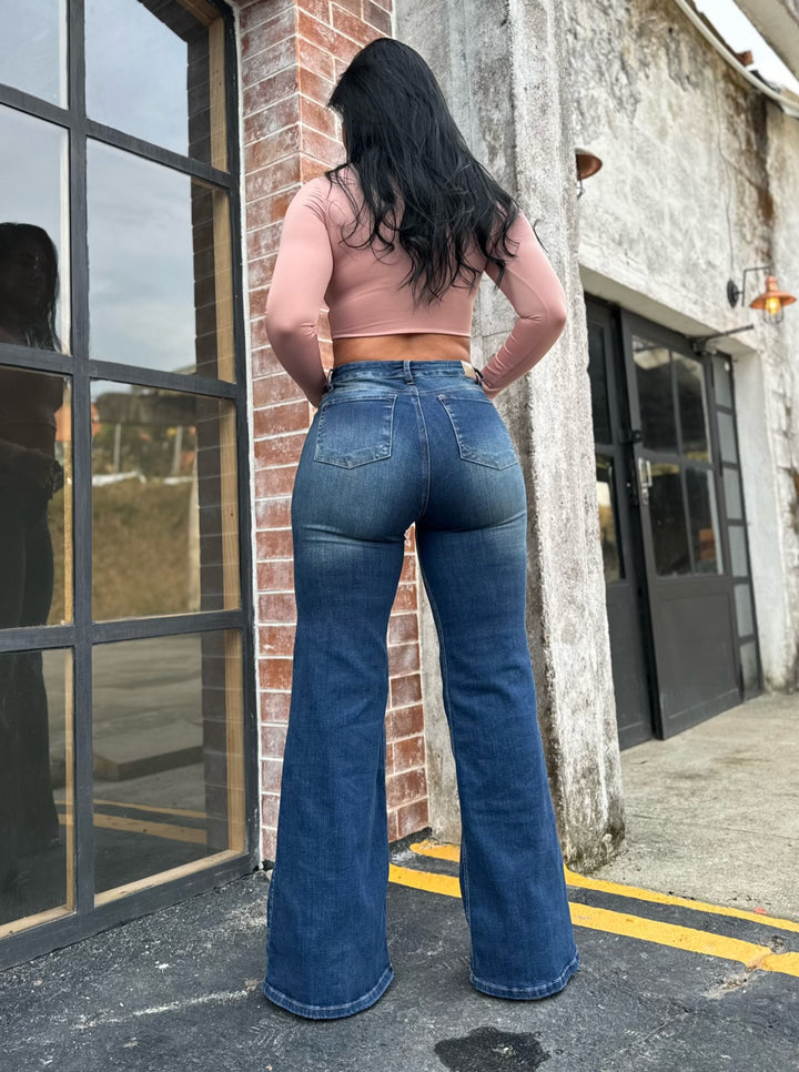 Ref: 93411-1 Jean bota recta, stretch, tiro alto, tono medio, cintura ajustada, con detalle en pierna.