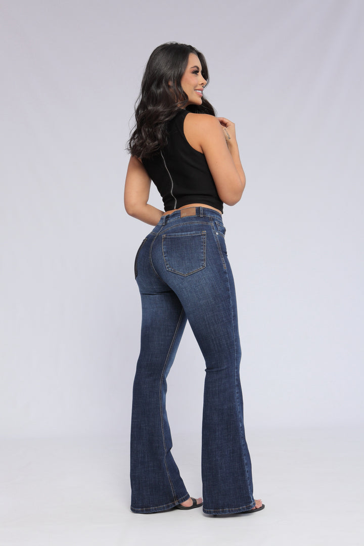 Ref: 25523-5 Jean bota campana, tono oscuro, stretch, cintura ajustada, con reserva en bolsillos.