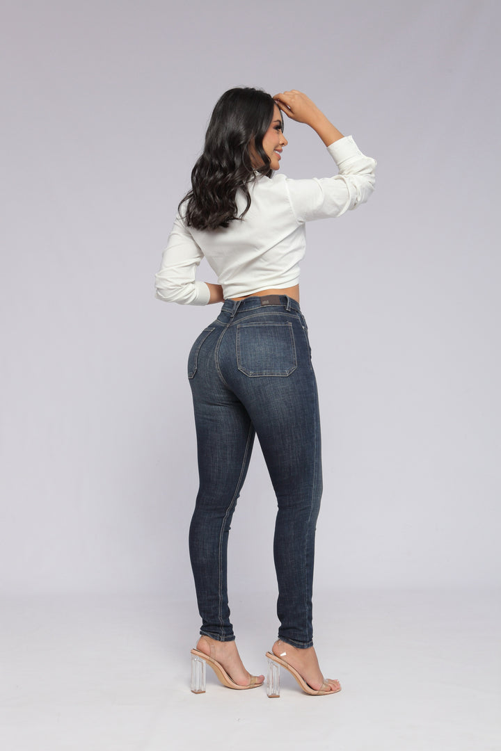 Ref: 15521-1 Jean skinny, tono oscuro, stretch, tiro alto, un botón, con desgaste y dirty.