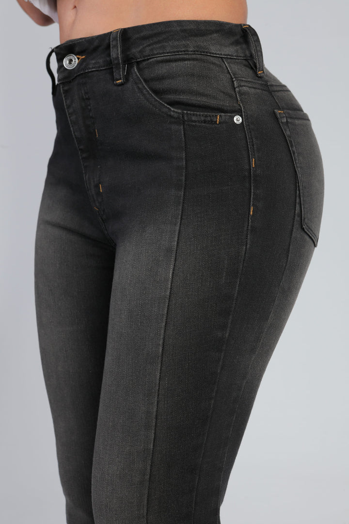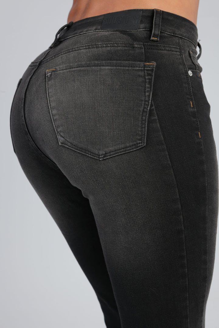 Ref: 14531-1 Jean skinny gris oscuro, stretch, un botón, con cortes laterales, costuras en contraste y detalle desflecado en bota.
