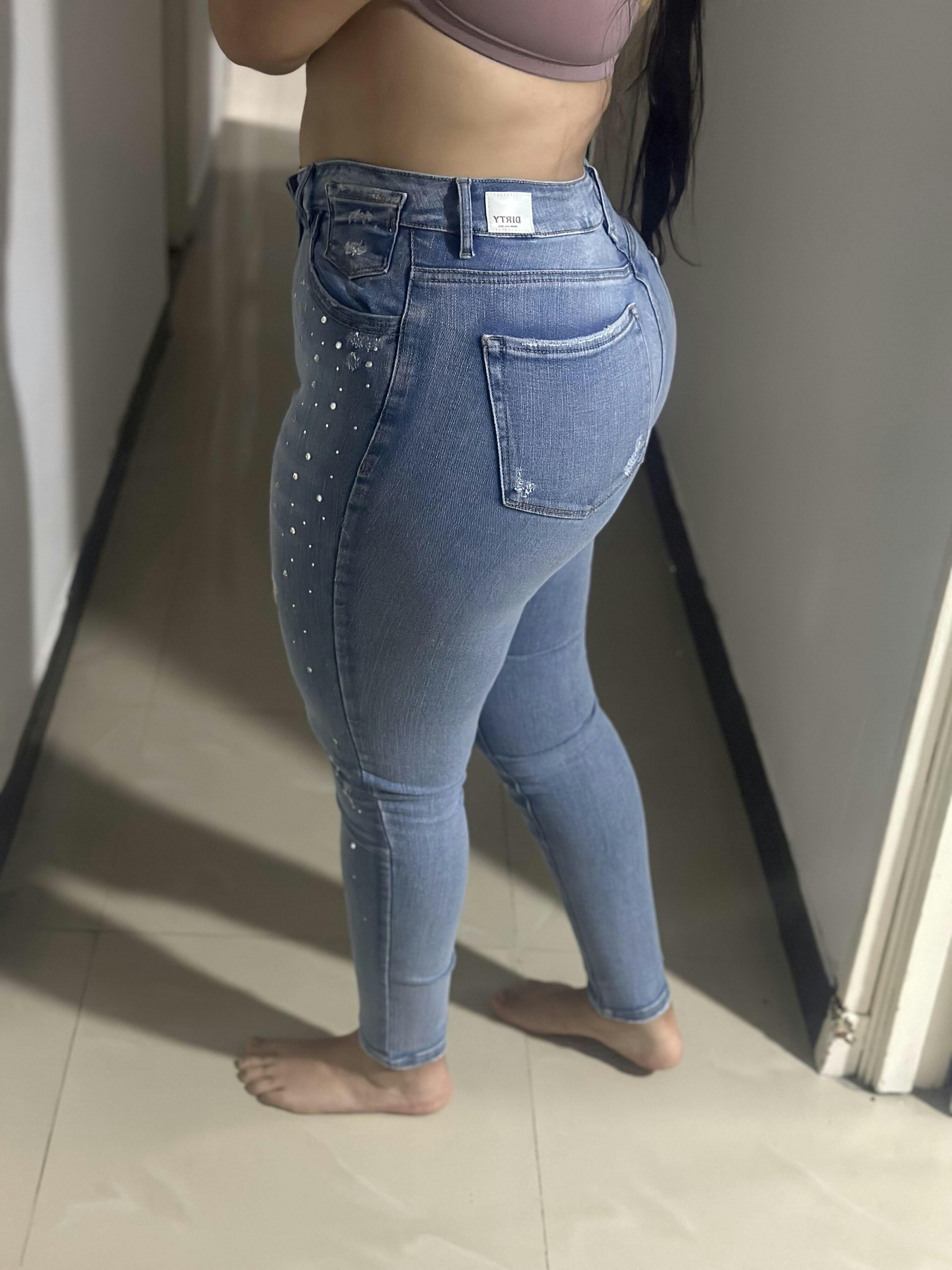 REF: 12422-1 Jean skinny strech, tiro alto, tono claro, cintura ajustada, con cristales.