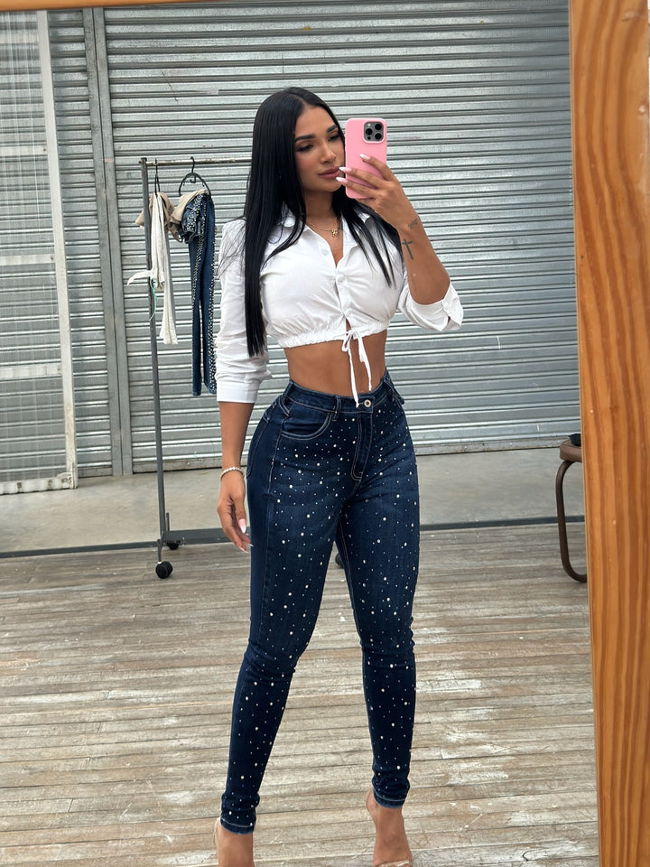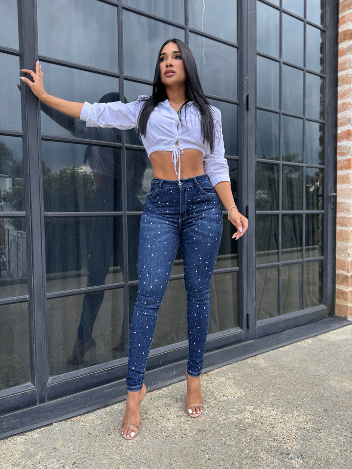 Ref: 17407-1 Jean skinny, un boton, strech, tono oscuro con desgaste y cristales.
