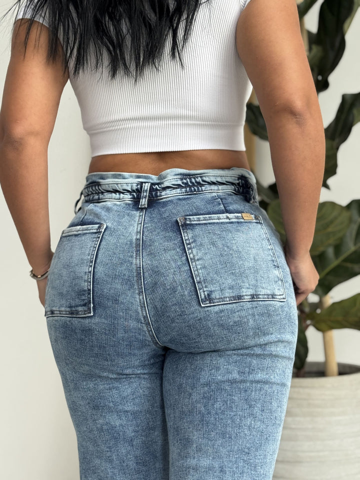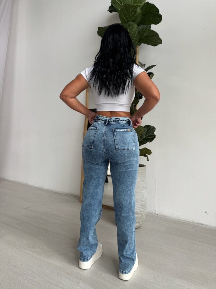 Ref: 94524-1 Jean bota recta, stretch, tono medio, tiro alto, un botón, con elástico en la pretina.