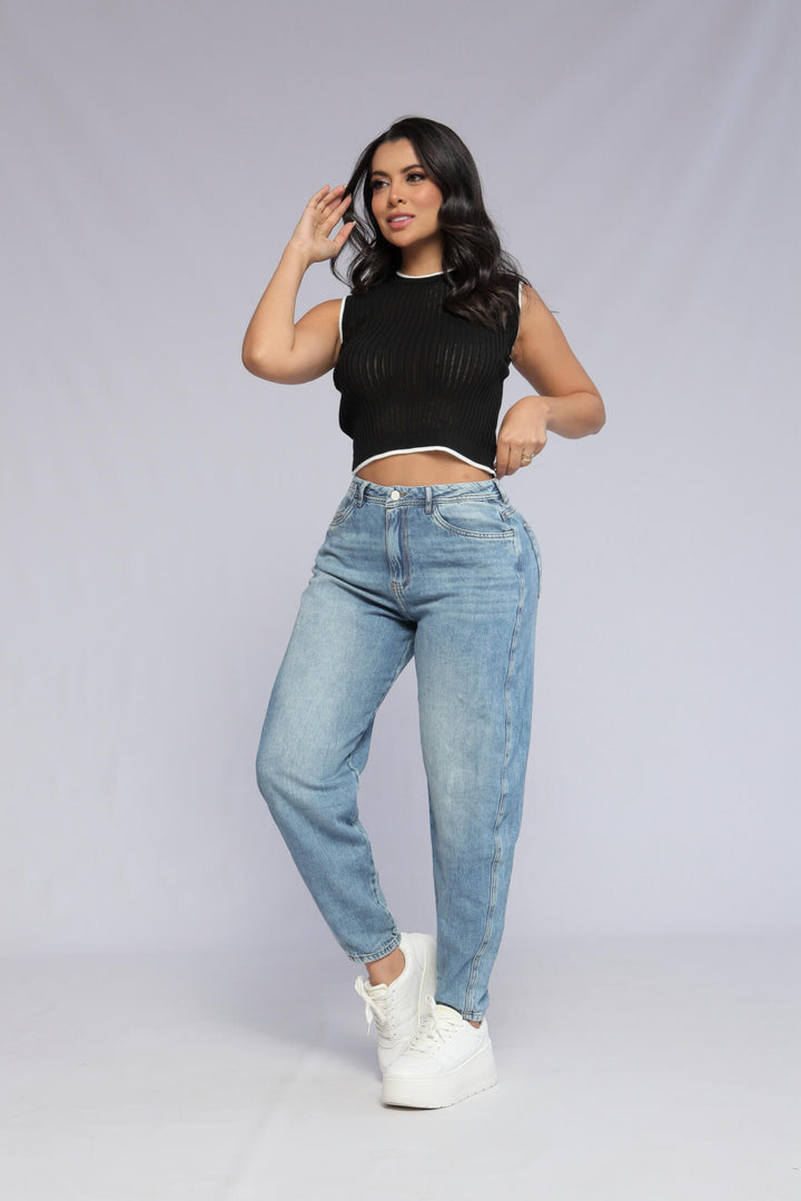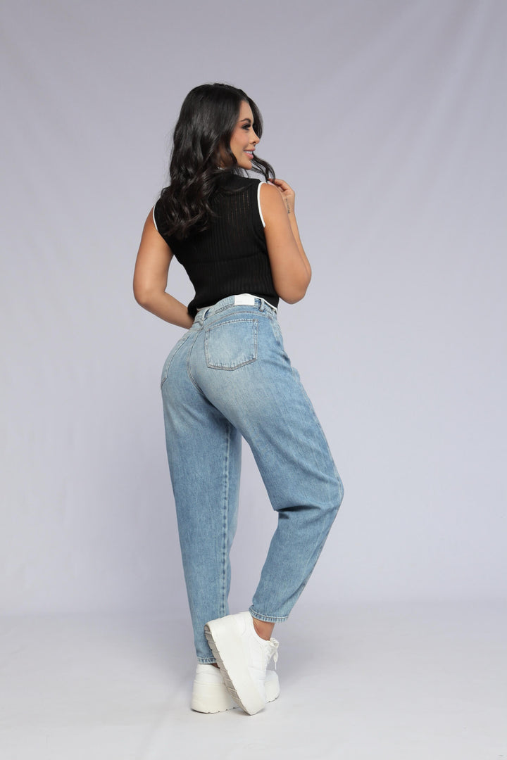 Ref: 94550-1 Jean barrel, tono claro, rígido, un botón, tiro alto, básico con desgaste.