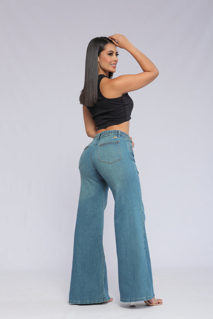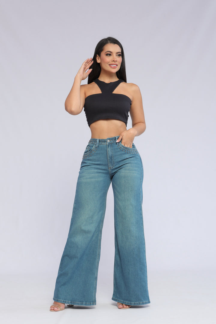 Ref: 95504-1 Jean wide leg, tono medio, rígido, un botón, tiro alto, con dirty, taches en pretina y bolsillos.