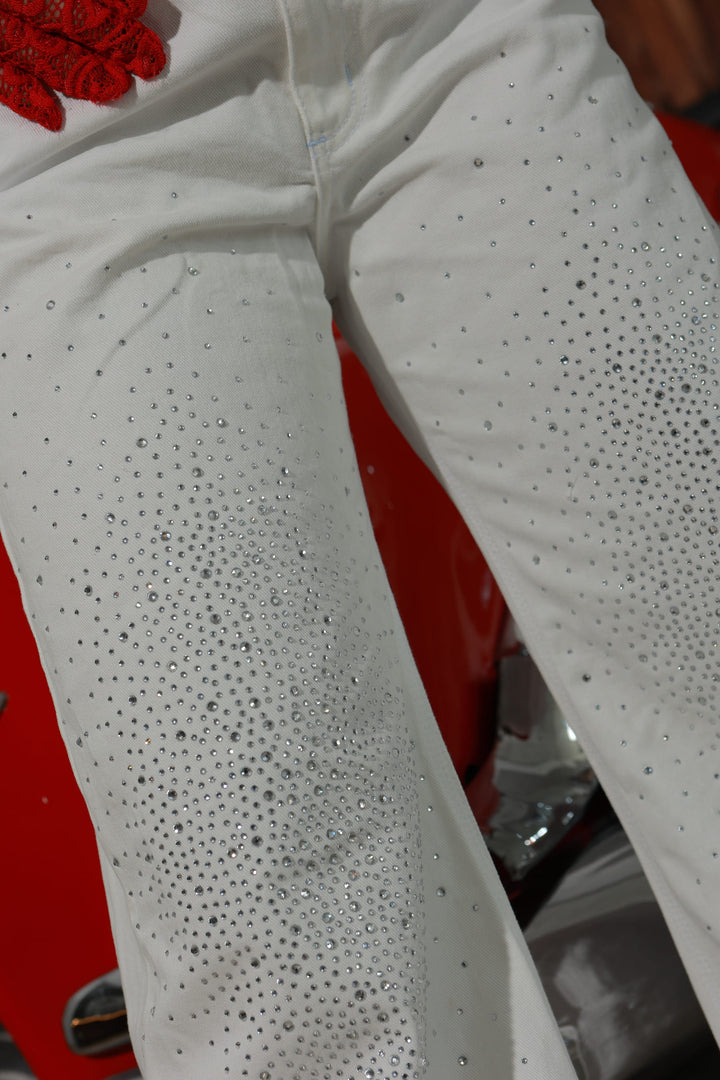 Ref: 95514-1 Jean wide leg blanco, rígido, un botón, cintura ajustada, con cristales.